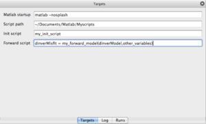 - Forward script is the Matlab script of the user that computes the forward model and the misfit between the forward model and the data. This line is executed as it would be in Matlab. Among its input, it should receive the DinverModel variable, a vector of real values containing the model parameters as defined in the Parameters panel. It has to output the variable DinverMisfit, containing the misfit value (real number).