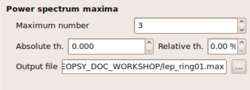 There will be two output files created. The name of the output file and the location (path) for storing the output files is specified in the lowest layout group of the Processing tab titled Power spectrum maxima with the option Output file. Pushing the button to the right of the editable textbox entry will open a file browser and allows you to navigate to some location in your directory tree and specify an output file name.