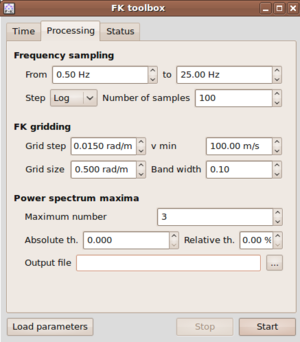 These parameters are laid out in different parts of the f-k toolbox widget. Note, that the toolbox has three main tabs: Time, Processing and Status.