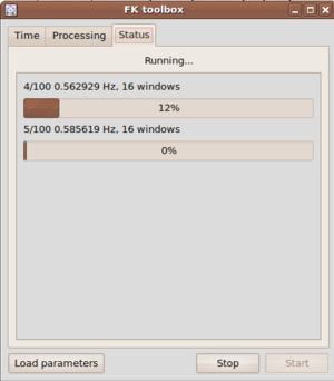 Now as you have tested your parameter configuration and had a preliminary look on the data, you can start the processing by simply pushing the Start button in the lower right corner of the f-k toolbox (visible in all tabs). You can check the progress of the computation in the status tab of the toolbox. Note that geopsy and its plugins are multi-threaded applications and will use all available cpu-cores of your hardware. The progress for each computation thread will be displayed separately.