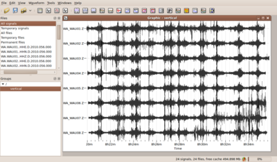 Alternatively, you can download here a ready-to-go database file and the corresponding waveform files at this location. Note that you have to re-locate your waveform files as described in detail in this page. This database contains two predefined groups: vertical and All 3C. Please test, whether you can view the signals, use drag and drop functionality or check the coordinate settings in the table view or map view. If you display the predefined group vertical in a graphic viewer, you should obtain a picture similar to the one displayed on the right.