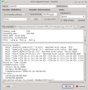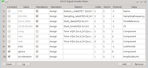 The above figure shows the rules defined for format GeoSIG. Values for Component data are handled in a particular way. The value, either constant or captured from the pattern, is translated to a standard component thanks to a look-up table descrided in the next section. This table can be also used to ignore some columns or to specify a Time column. The latter is for formats that do not provide explicit information about the starting time in the header, instead they provide one time stamp per sample.