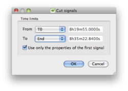 By clicking on Cut, a dialog box appears requesting Time Limits, i.e. the time interval to be extracted. This cutting corresponds to the application of a boxcar taper. However, unlike the Taper, the whole signal outside of the boxcar window is completely removed and not simply replaced by 0 values.