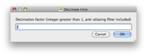 Decimate time, reached from the Waveform menu, decreases the sampling frequency of signals in the active signal viewer. By clicking on Decimate time, a pop-up window appears requesting the decimation factor, i.e. the ratio between current sampling frequency and desired sampling frequency.