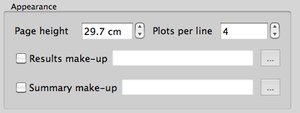 When processing several files at the same time, single graphics output are displayed on the same page. The number of individual graphics to be displayed per line may be determined with the Plots per line spin box, and the page heigth adjusted with the Page heigth spin box.