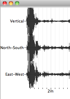 The above make-up is the default make-up for a signal window displaying the three components (Z, N and E) of a recording named Strong_peak.