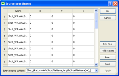 Set sources option allows to define shot position in case of active seismic experiments. It works in a very similar way as the set receiver option in the Edit menu. When the set source button is pushed in the Edit menu a window appears in which source positions are displayed as a table. Default fields displayed in this table are: Source name, X, Y & Z coordinates. Source positions can be edited in different ways.