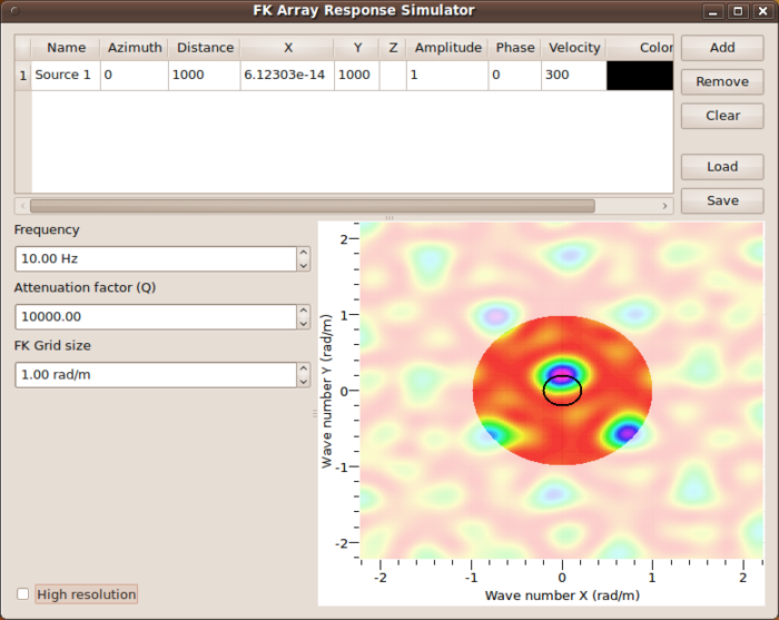 As in warangps, the array response function will be immediately computed and displayed, however, this time not for a vertically incident plane wave (impinging on the array configuration from below with ), but for a plane wave with parameters as given in the first table line. On default, a harmonic signal propagating at a wave speed of 300 m/s at a signal frequency of 1 Hz and a propagation direction of . Note that a black circle will overlaid to the wavenumber map similar to the display in the wavenumber browser window in FK and HRFK toolboxes.
