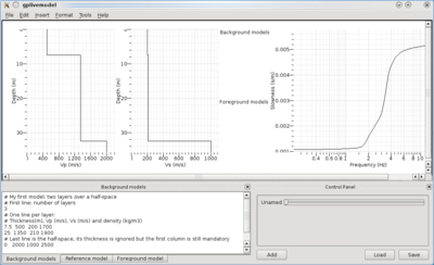 Background models and Reference model are free text editors containing layered model descriptions. Model format is the same as for gpdc, gpspac, gpell or gpsh. Control panel has a collection of sliders to control the transformation of Reference models into Foreground models. A right-click on a slider lets the user editing the effects.