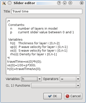A slider has a name displayed on the left. This name can be edited in the same dialog box as the slider action by right-clicking on slider and choosing Edit. A slider has a value (called p for parameter). This variable is 0 when the cursor is on the left end and 1 when it is on the right end. It can take any of the 101 discrete values between 0 and 1. Reference models are described by 4 (or 6 for SH only) vectors: