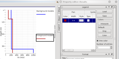 - Clearly identify background and foreground models by setting different colors for background and foreground models. Double click on legends located on the left of the dispersion curve plot. In the legend properties, set at least one entry for each legend. Adjust colors and other attributes to your taste.