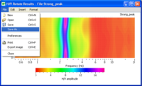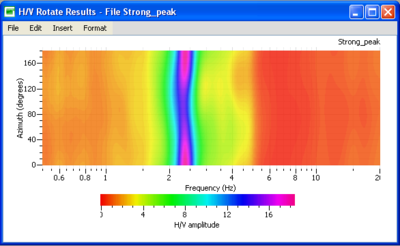 Here, a series of H/V is calculated from 0° to 180° every 10 °, and is presented in a frequency-azimuth graphic. This graphic can be used to analyse the H/V in the horizontal plane. Results are displayed between 0° and 180°, the 180-360° being a symetry of the 0-180°.