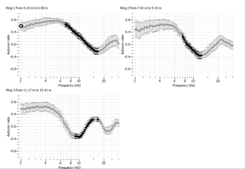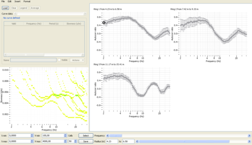 , one can check for each frequency and each ring relation between autocorrelation coefficient and phase slownesses as indicated by the black dots (see figure below).
