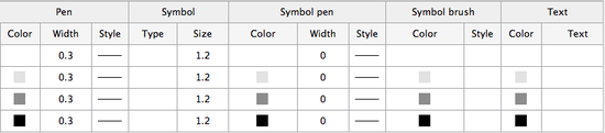 box is not checked, different colors can be used to display the items Pen, Symbol pen, and Symbol brush of a given entry.