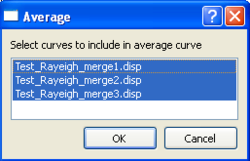 After pressing the Average button a pop-up window appear where you can select which curves, that have to be loaded before, should be used. By selecting the three Dispersion Curves Loaded (Test_Rayeigh_merge1.disp,Test_Rayeigh_merge2.disp,Test_Rayeigh_merge3.disp) you can have a Merged Curve. Note that now you have on the curve list (scroll bar titled Curve data) an additional curve with the Name average that you can further manipulate. Be careful that Curves that have overlapping frequency ranges are Averaged and these with non-overlapping frequency ranges are Merged.