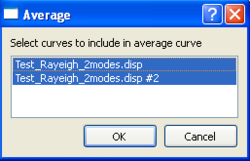 After pressing the Average button a pop-up window appear where you can select which curves, that have to be loaded before, should be used. By selecting the two Modes of the Rayleigh Dispersion Curves Loaded you can have an Average Curve. Note that now you have on the curve list (scroll bar titled Curve data) an additional curve with the Name average that you can further manipulate. Be careful that Curves that have overlapping frequency ranges are Averaged and these with non-overlapping frequency ranges are Merged.