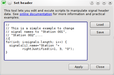 This section explains how to modify header information stored in a database in a very efficient way. Any information about signals can be viewed in a table. Signals can be modified one by one by cell editing (Ctrl+K). For huge number of signals this is boring and time consuming. Instead, you can create formulas and apply them with one single click. The syntax for these formulas is rather simple.