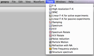 Geopsy software provides powerful tools for advanced signal processings, for instance ambient vibration array processings or H/V spectral ratio. A plugin mechanism allows you to install only selected tools corresponding to your need. Through the menu Preferences it is possible to add (or remove) new tools without upgrading the main Geopsy frame. The advanced signal processings tools are available under the menu Tools or directly by clicking on the icons in the toolbar.