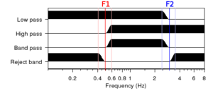 thumb|left|300px|Cosine taper functions in frequency domain for various band configuration.