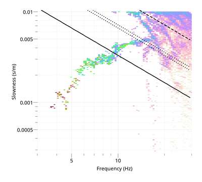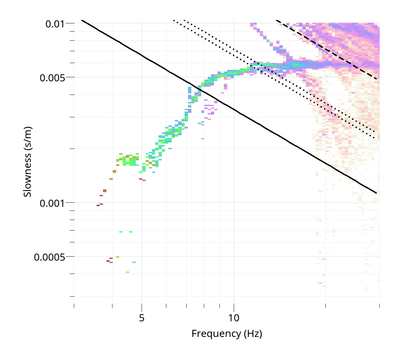Dispersion curve obtained with the vertical component high resolution FK (manual limits and maximum overlap at 100%).